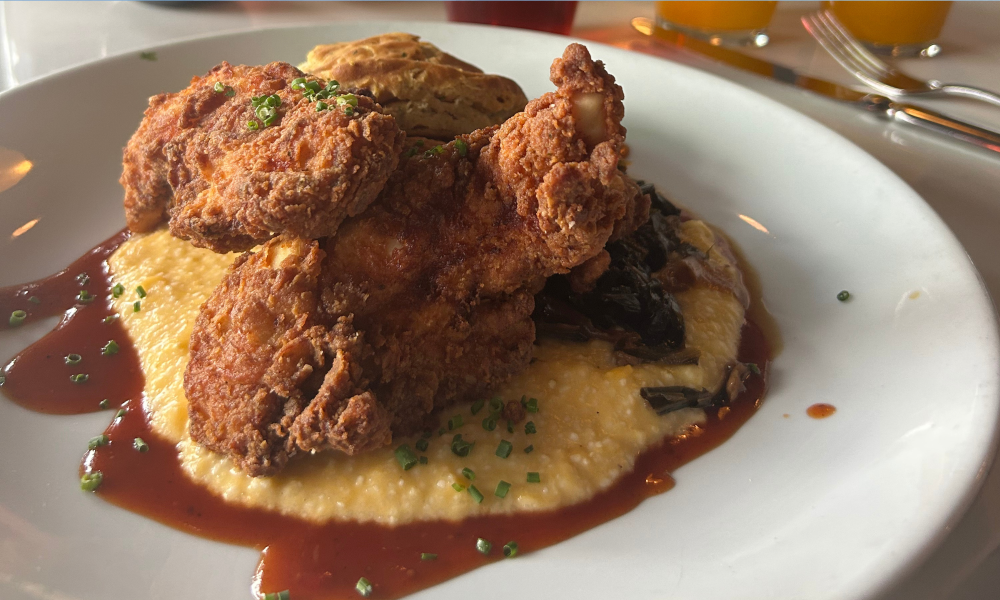 Crispy Buttermilk Chicken Cheddar Grits, Braised Collards & Buttermilk Biscuit
